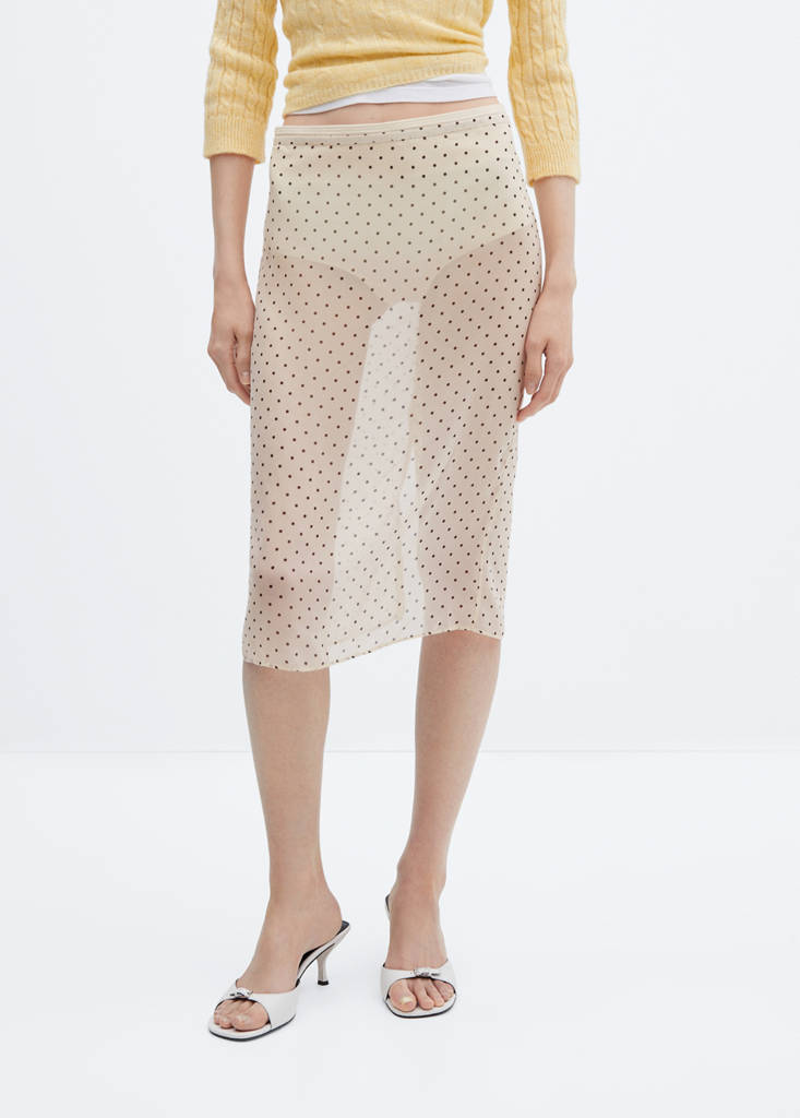 Tyg i blandning av återvunnen polyamid. Halvtransparent tyg. Flytande tyg. Mididesign. Rak design. Stängning med dold dragkedja på baksidan. Bakre slits vid fållen. Kantstickning. Innerfoder. Total look. Fest-, ceremoni- och kommunionskollektion. Romantisk stil