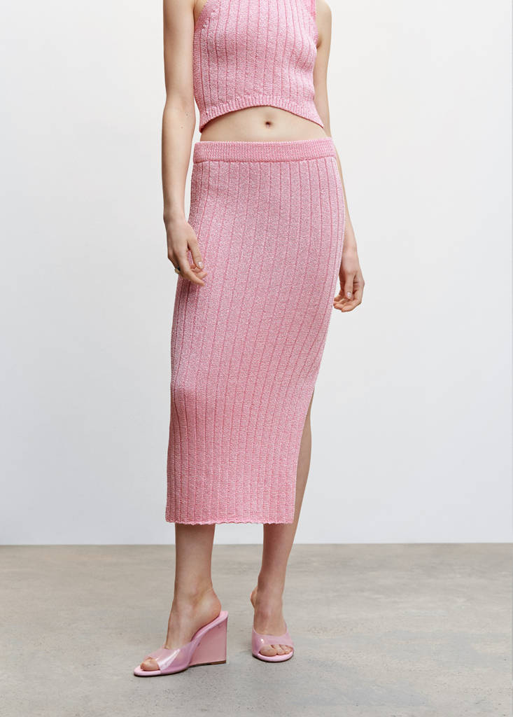 Medelstickning. Ribbat tyg. Glansigt utförande. Mididesign. Figursydd design. Elastisk linning. Sidoöppning. Designad i Barcelona. Total look. Festival Season