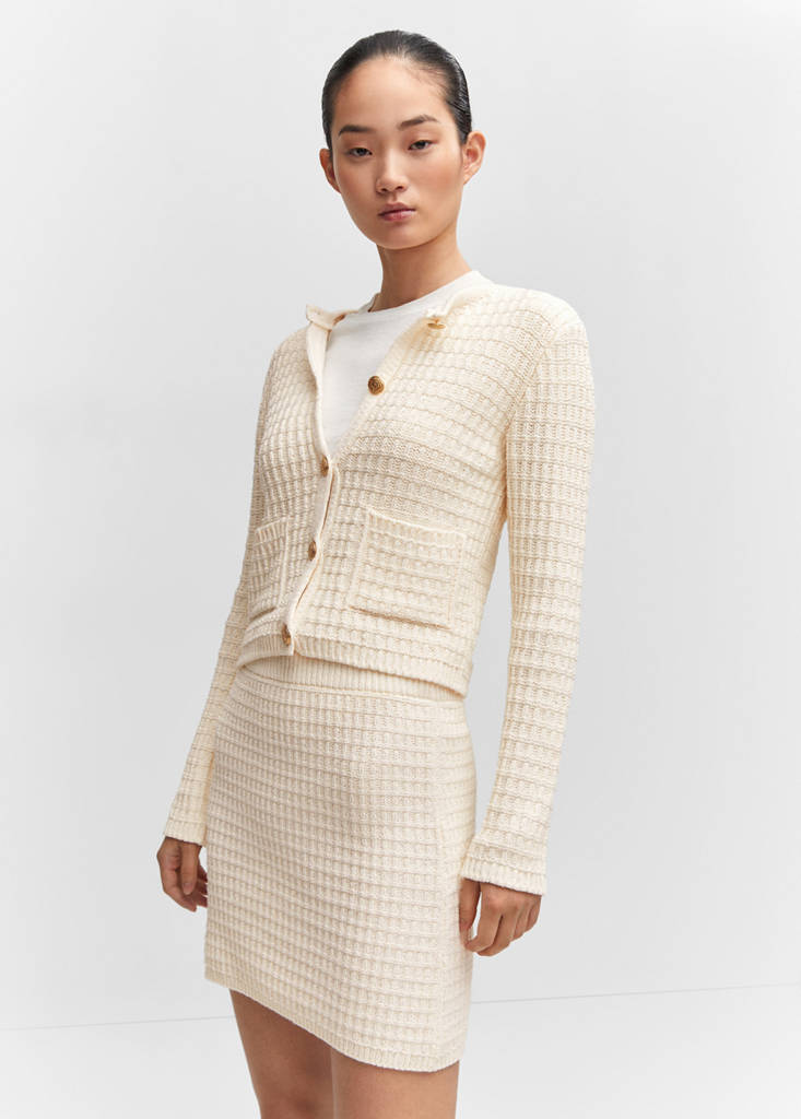 Grovstickat tyg. Rak design. Kort design. Midja med resår. Utan stängning. Total look