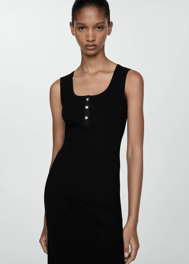 Ribbstickat tyg. Mididesign. A-linje design. Rund halsringning. Ärmlös. Breda axelband. Knappstängning framtill. Satinerat utförande