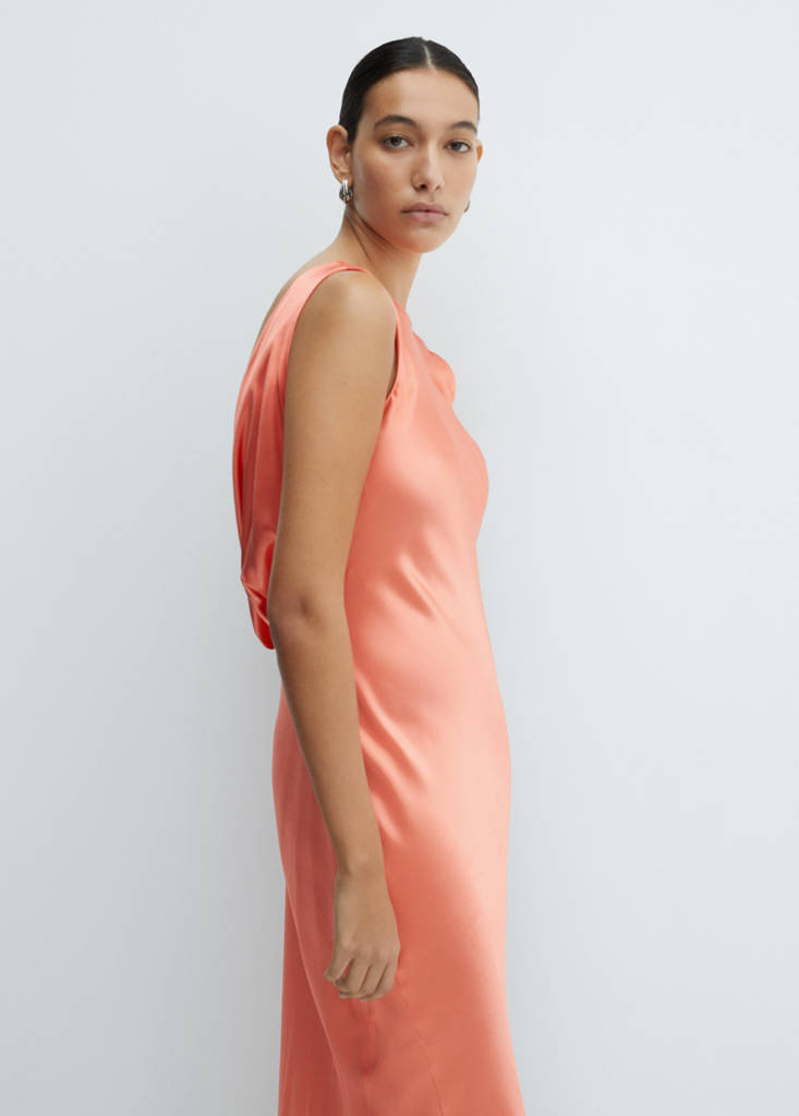 Satinväv. Flytande tyg. Lång design. A-linje design. Rund halsringning. Ärmlös. Breda axelband. Öppen rygg. Draperad detalj. Osynlig dragkedja i sidan. Fest-, ceremoni- och kommunionskollektion. Detta plagg tillhör vår eventkollektion, designad för att göra dig till den perfekta gästen på vilken fest, bröllop eller ceremoni som helst