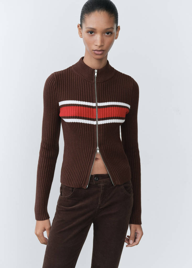 Bomullsblandningstyg. Ribbstickad. Mellanpunkt. Panel i kontrast. Långärmad. Hög krage. Blixtlåsstängning på framsidan