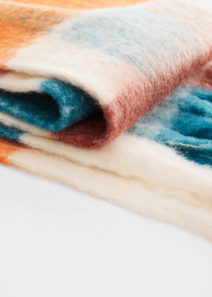 Ylleblandat tyg. Rut tryck. Fransar som avslutning