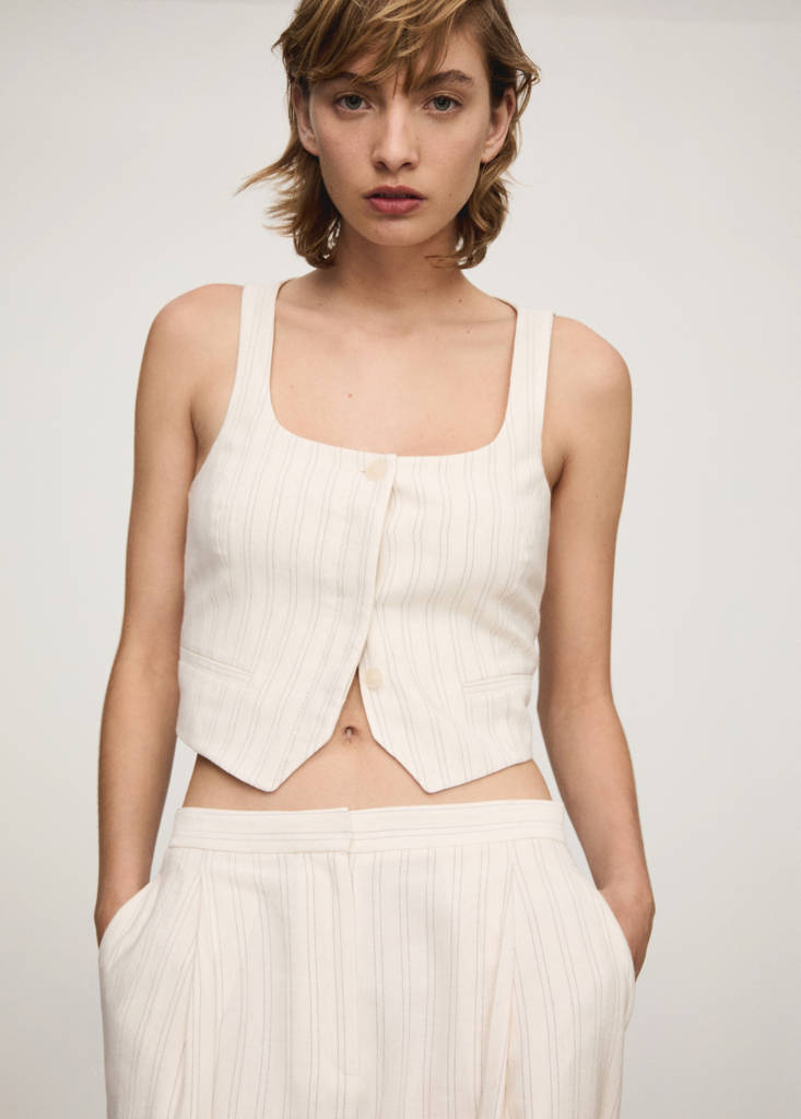 Bomulls- och linnemix. Kort design. Rak design. Randigt mönster. Kvadratisk ringning. Ärmlös. Två framfickor med kant. Innerfoder. Total look. Framknäppning