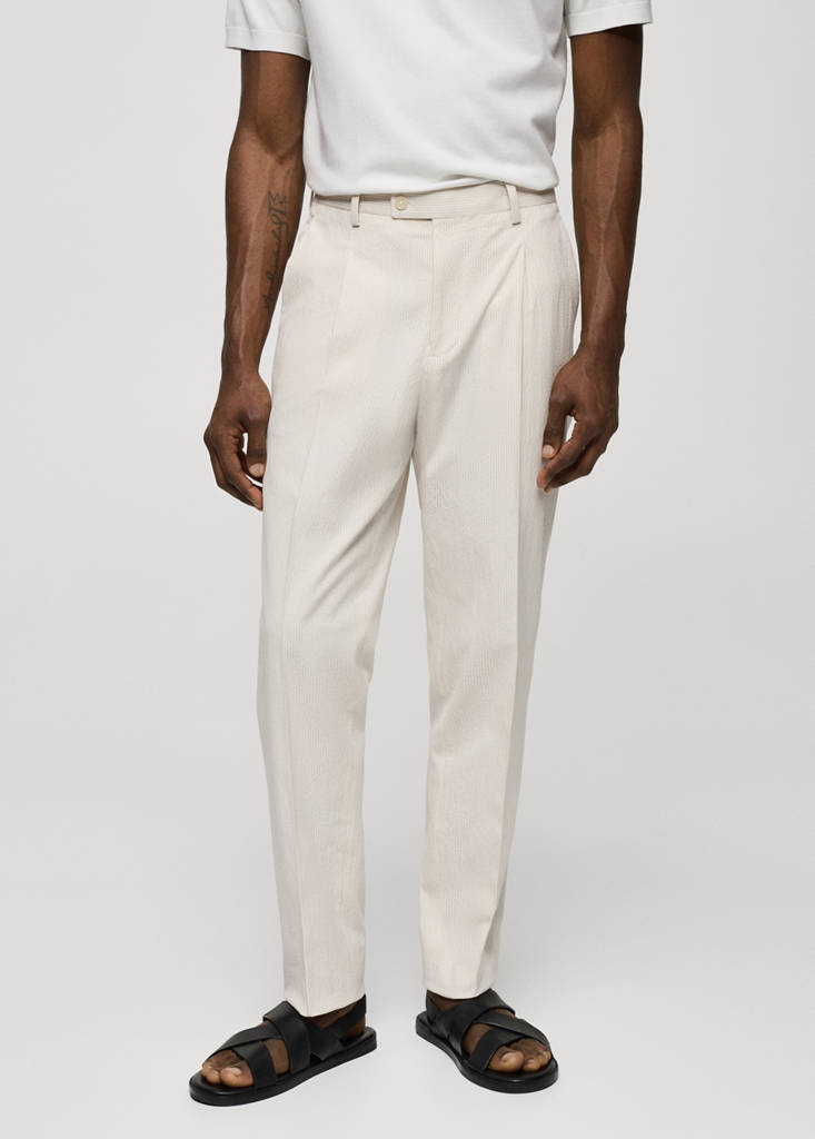 Slim fit. Tyg av bomull. Seersucker-tyg. Randigt mönster. Stängs framtill med knapp, hyska och dragkedja. Skärphällor. Pincett på framsidan. Två framfickor. Två passpoalfickor med knapp bak. Detalj av pressad rand framtill och baktill