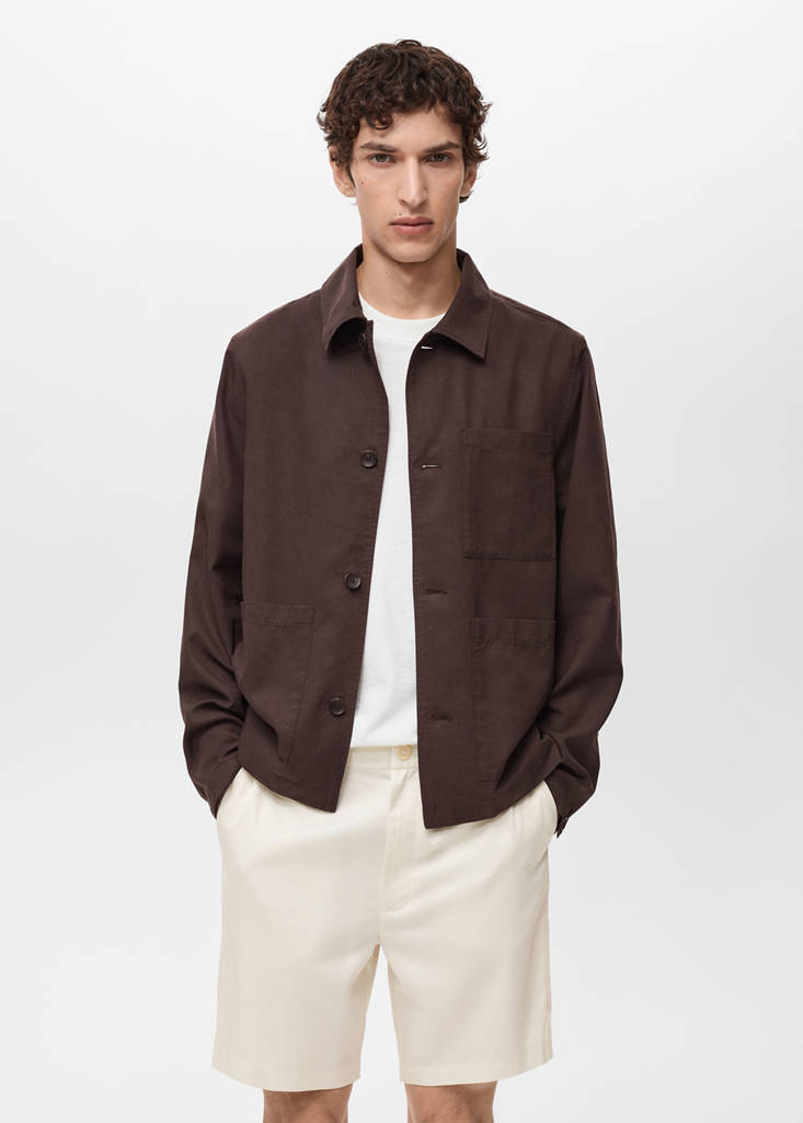 Straight-cut. Tygblandning av lyocell, bomull och linne. Skjortkrage. Lapp ficka på bröstet. Sidosfickor. Knappmanschetter. Framknäppning. Rak nederkant