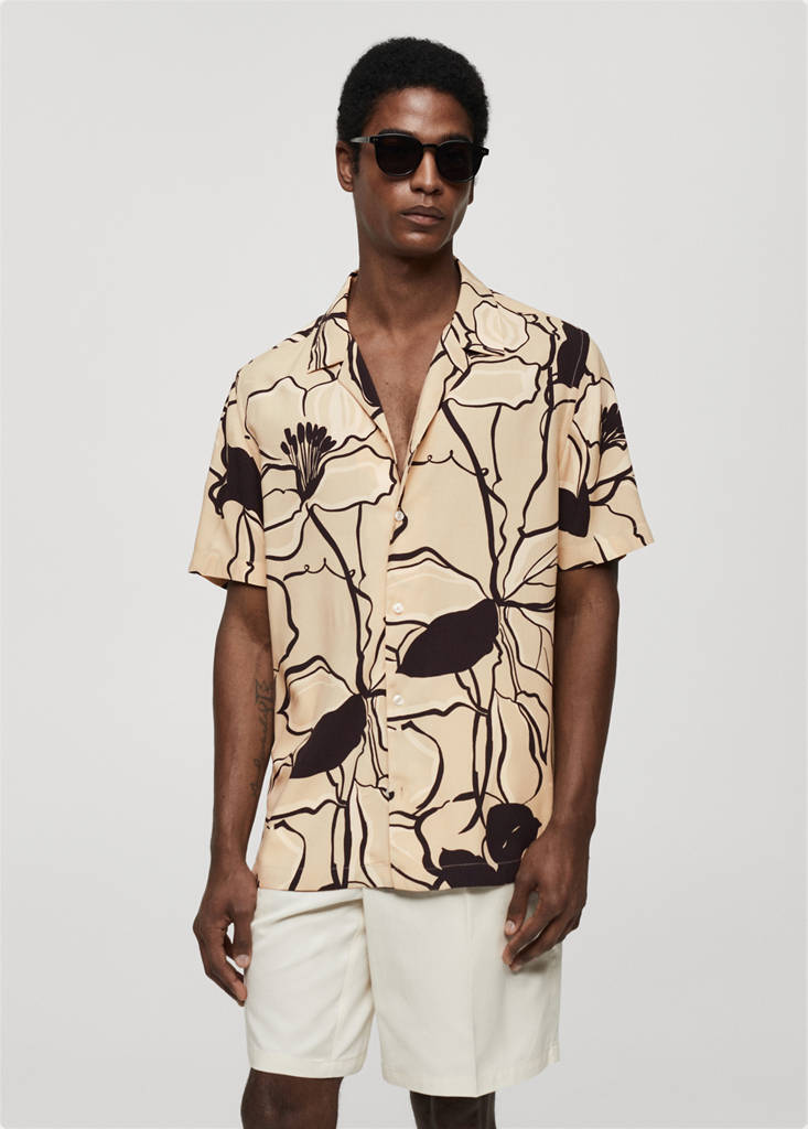 Regular fit. Flytande tyg. Kort ärm. Bowlingkrage. Rak nederkant. Framknäppning. Tryckt design
