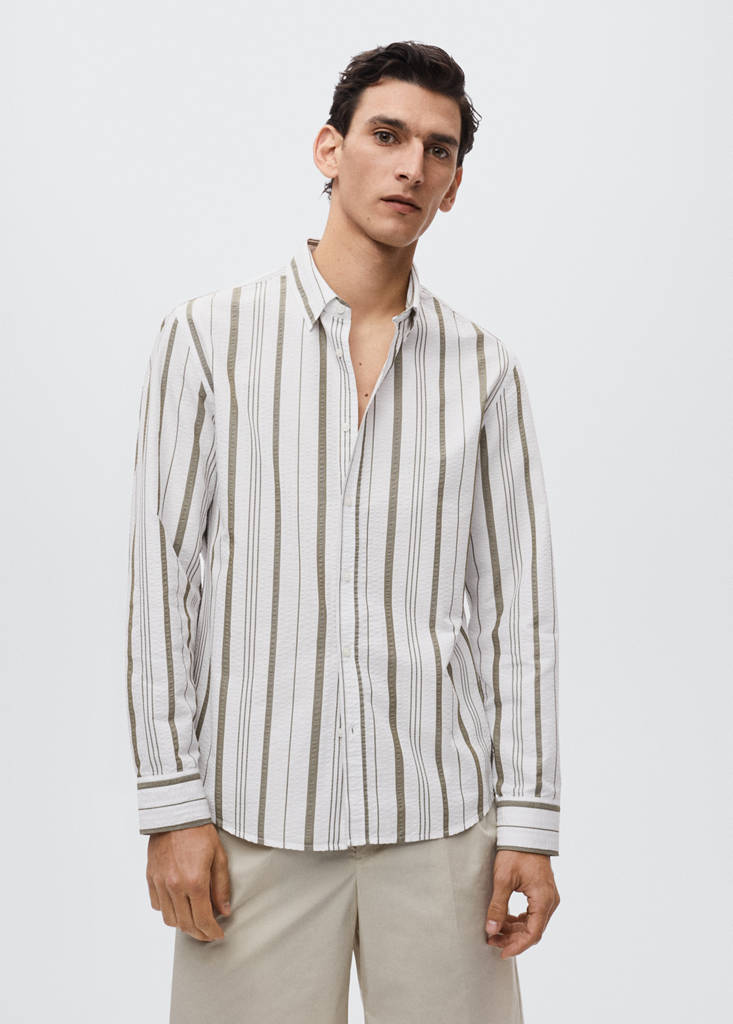 Regular fit. Randig design. Bomullsblandat tyg. Seersuckertyg. Klassisk krage. Lång ärm. Knäppning. Modellen är 187 cm lång och bär storlek M
