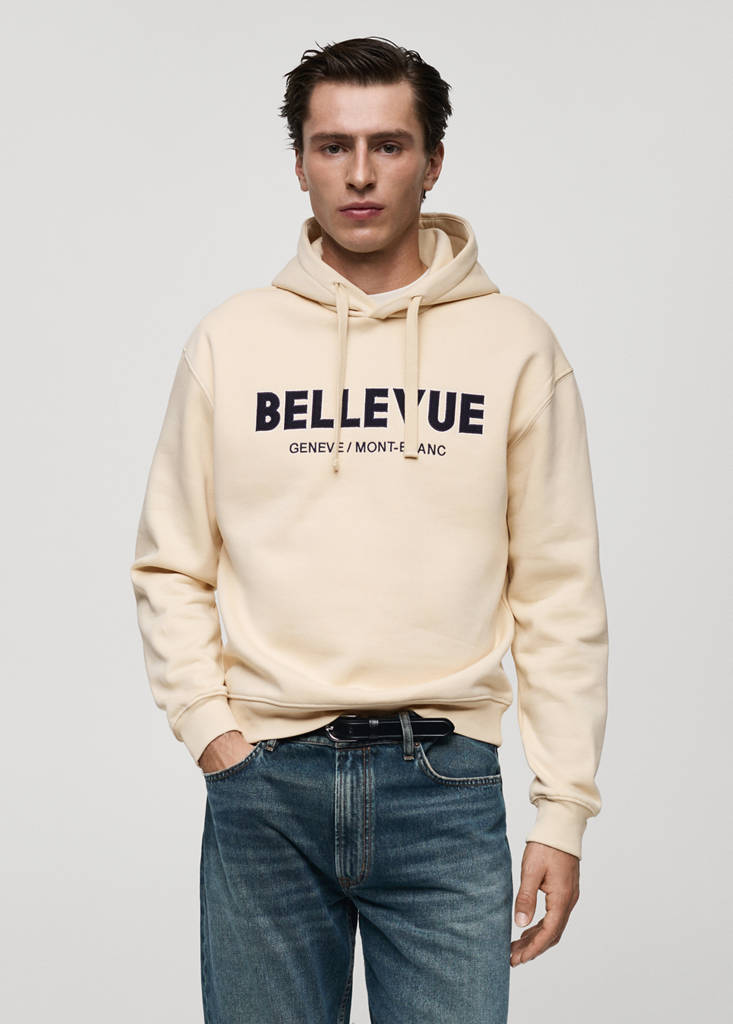 Med huva. Tryckt text på framsidan. Bomullsblandningstyg