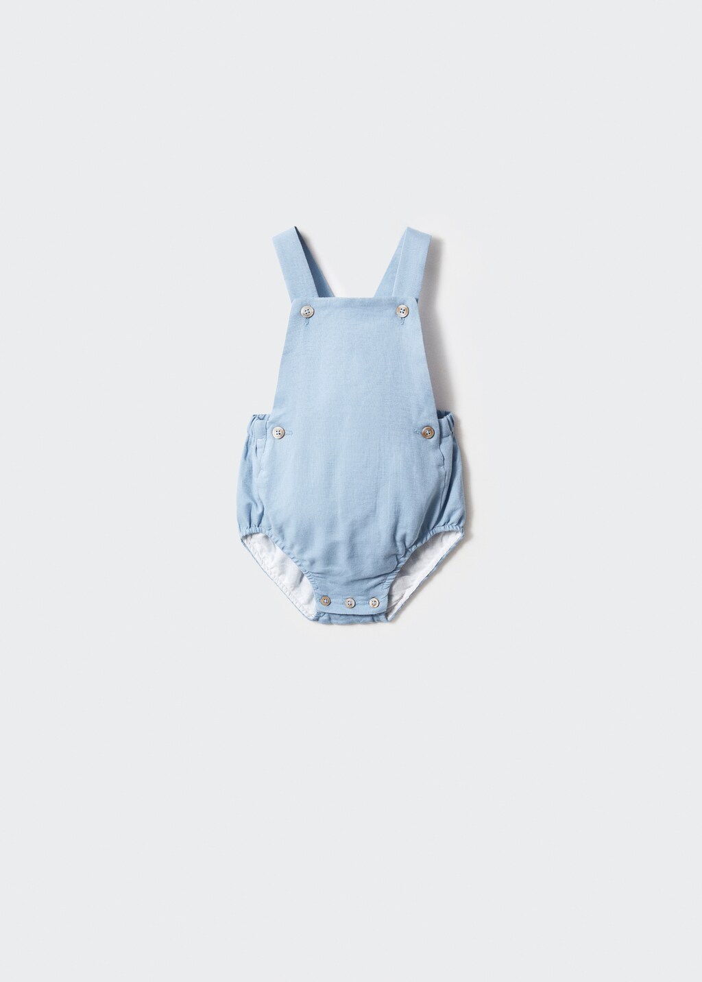 Linnetyg. Midja med elastiskt band. Korsade hängslen. Stretchfinish. Knappstängning.