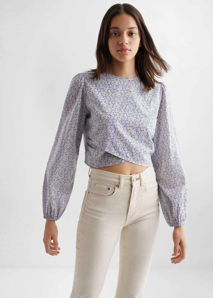 Flowy tyg. Rynkad detalj på sidorna. Rund krage. Puffärmar. Elastiska manschetter. Tårdropp stängning på baksidan