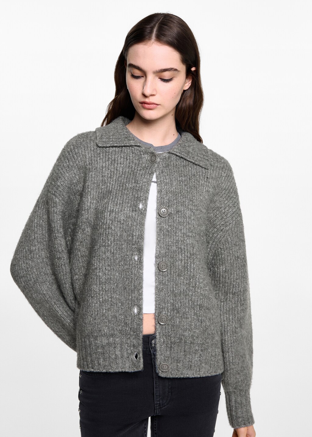 Grovstickat tyg. Oversize design. Polokrage. Lång ärm. Knappstängning framtill.