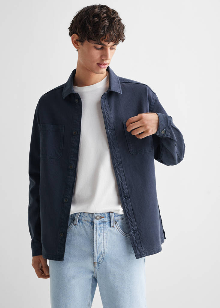 100% bomull. Rak design. Oversize design. Två framfickor. Skjortkrage. Långärmad. Framstängning. Knappstängning