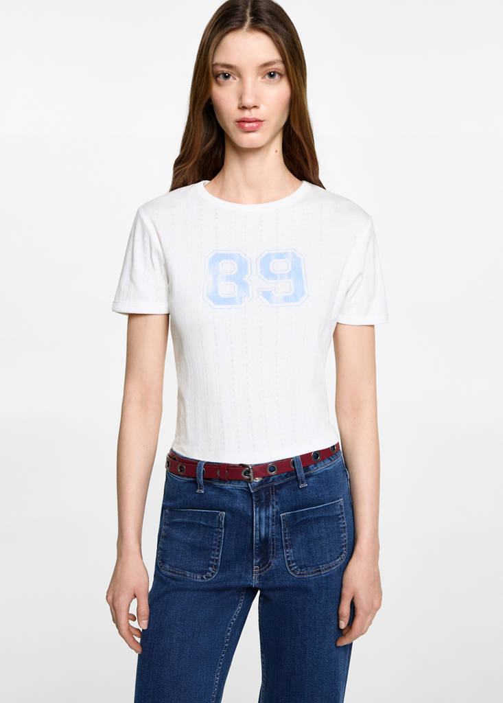 Bomullstyg. Rund halsringning. Schweizisk brodyr. Kort ärm. Tryckt bild på framsidan