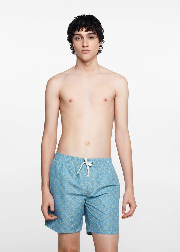 Geometriskt tryck. Rak design. Kort design. Midja med elastiskt band. Snörstängning. Två sidofickor. Lappficka bak