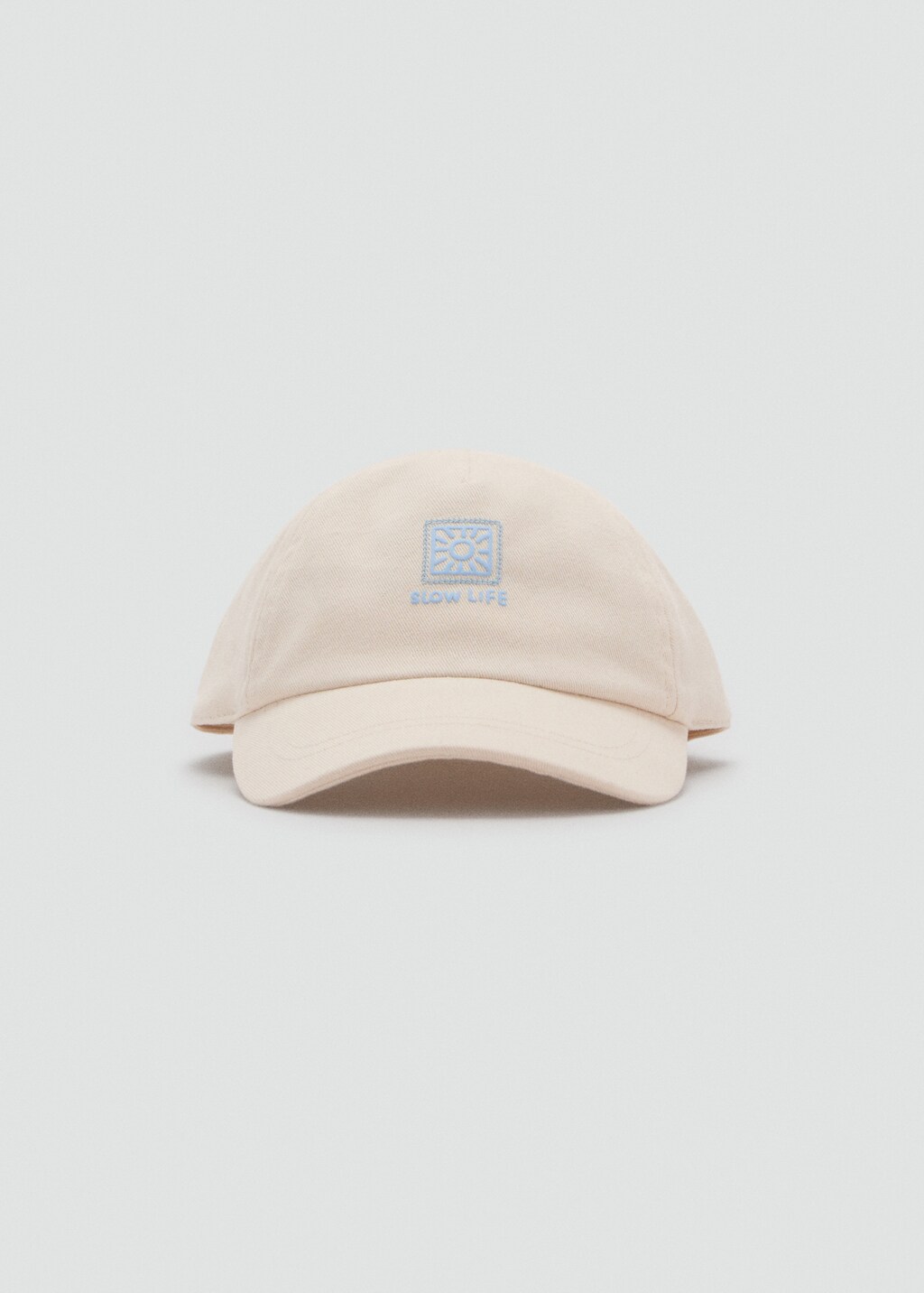 100% Cotton. With a visor. Relief drawing. No Fastening. Elastic ruching. Embroidered detail.