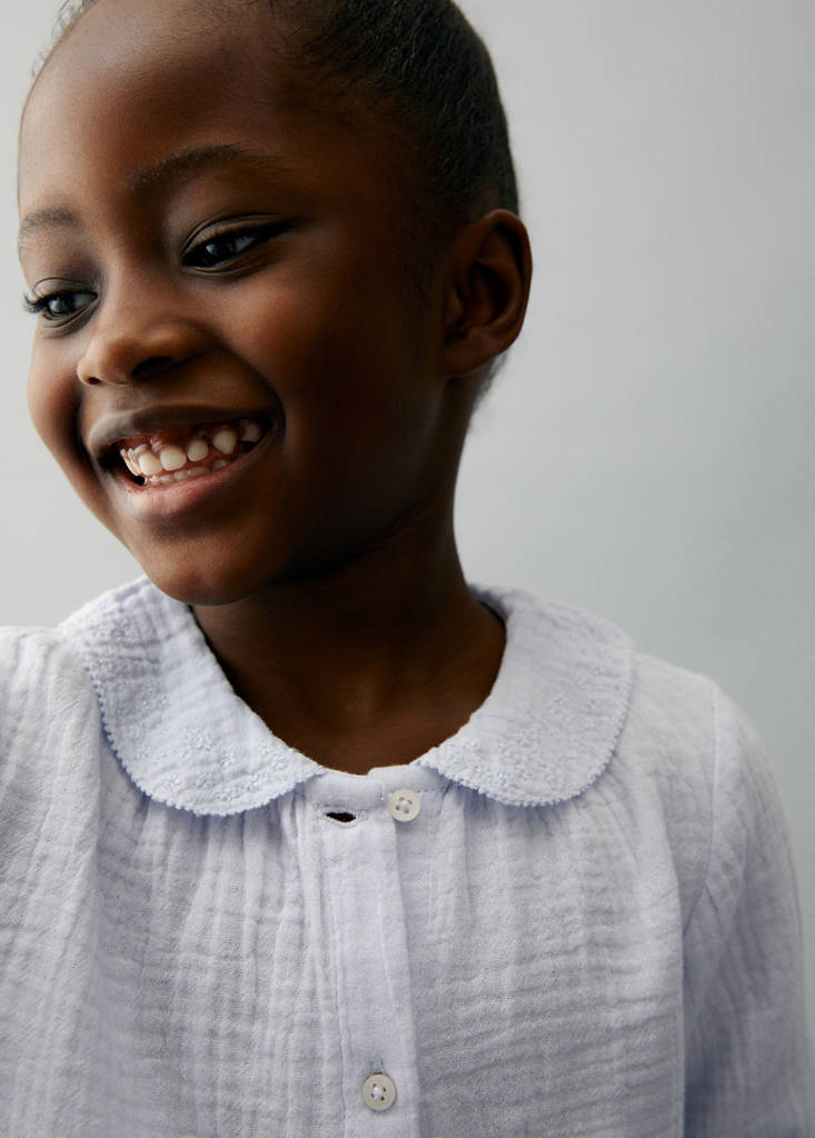 Straight design. Round neck. Babydoll collar. Long sleeves. Button up