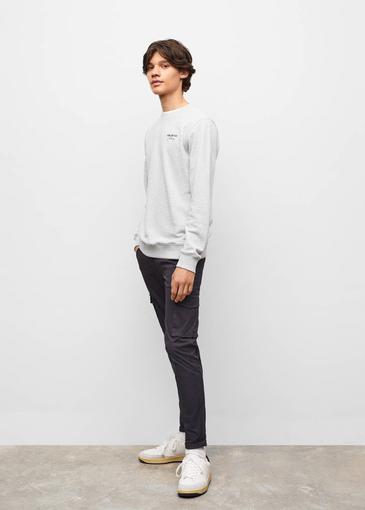 Fabric with cotton. Sustainable cotton. Straight design. Standard design. Unclosed. Medium. Regular fit. Rounded neck. Long sleeve. Elastic cuffs. Embroidered message. The model is 188cm tall and is wearing a size L. Teen collection