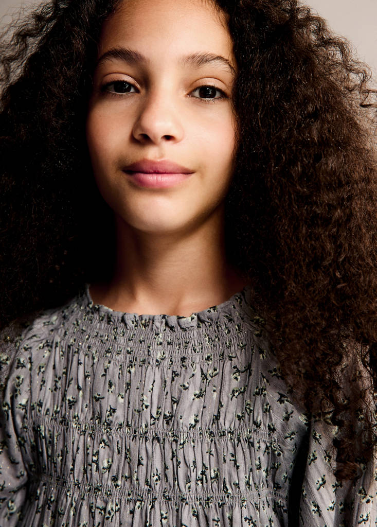 Fabric with cotton. Straight design. Lurex detail. Gathered detail. Gathered Waist. Long puffed sleeves. Short design. Button closure at the back. Printed design