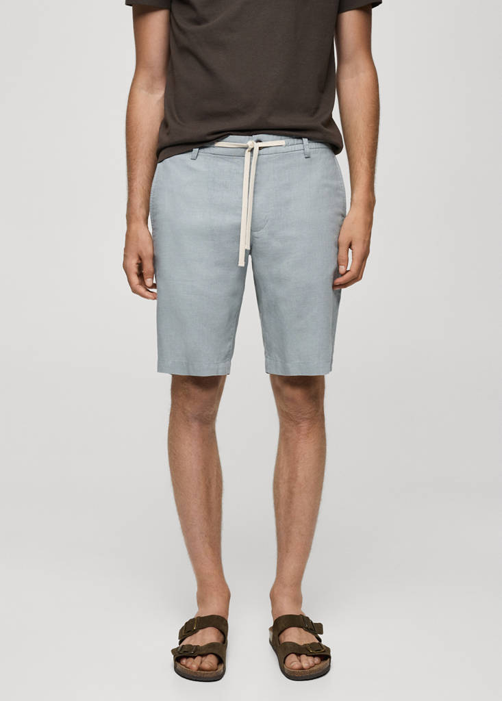 Slim fit. 100% linen fabric. Belt loops. Elastic waist with adjustable drawstring. Two front pockets. Two welt pockets with button at the back. Front zip and button closure