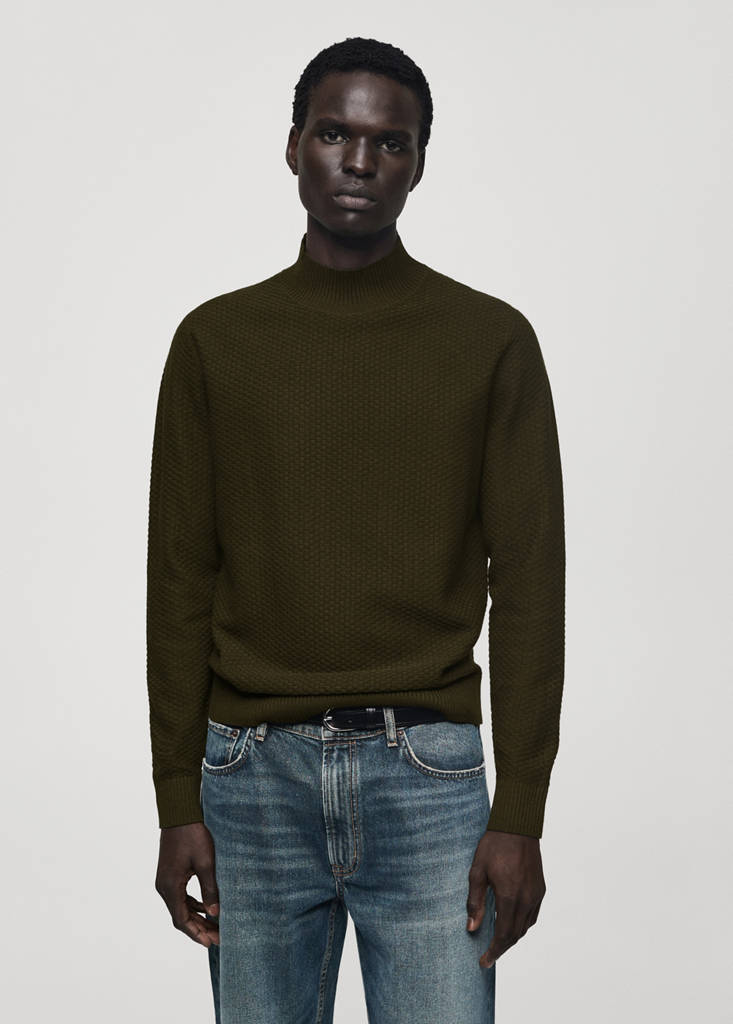 Cotton sweater with perkins-neck structurePrice historyInitial price struck through [€ 49,99 ]€ 49,99Second price struck through [€ 38,99 ]€ 38,99Current price [€ 13,99 ]€ 13,99-72%Select a colourKhakiSelect your sizeSNot available. I want it!MNot available. I want it!LNot available. I want it!XLNot available. I want it!XXLNot available. I want it!MeasurementsNotify meRegular fit. Cotton blend fabric. Fine knit fabric. High collar. Quadrille structure. Ribbed finishesDetails, composition and careStore availability