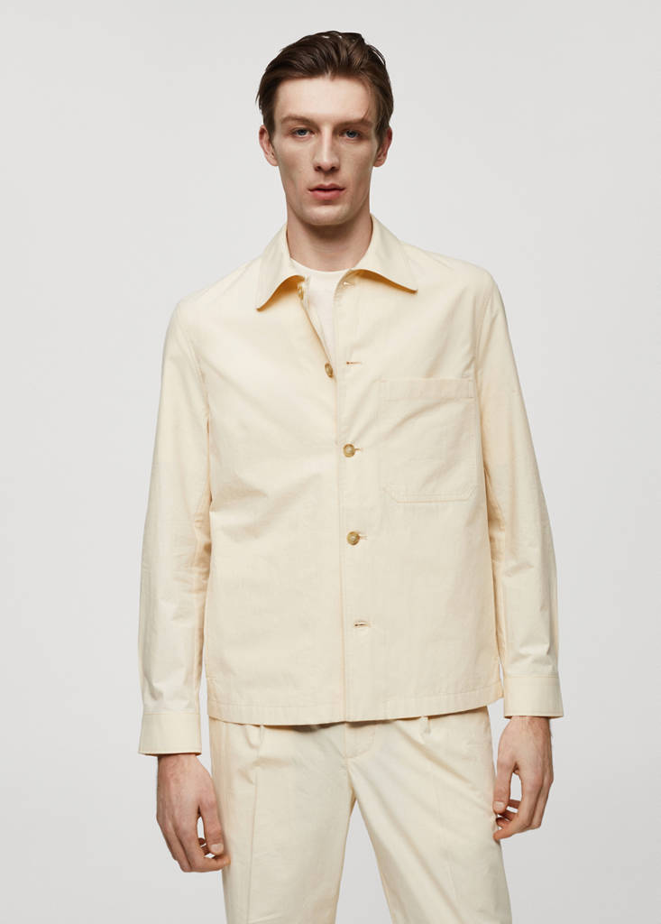 Set available as total look. Slim fit. Shirt collar. Patch pocket on the chest. Straight hem. Two front welt pockets. Long buttoned sleeves. 100% cotton fabric. Front closure with buttons