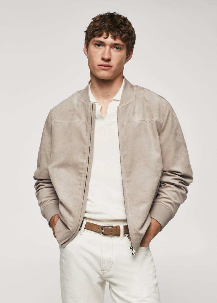 Bomber design, faux suede, front zip closure, long sleeve with elastic cuffs, two side pockets with flaps, hem with elastic band, inner zipped pocket, inner lining, the model is 183 cm and is wearing a size M.