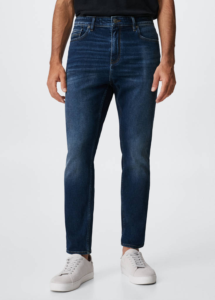 Tapered fit: wide cut at the top that narrows from the knee to the ankle. Denim-style cotton fabric. Dark wash. Belt loops. Zip and button fastening. Five pockets. Denim jeans style