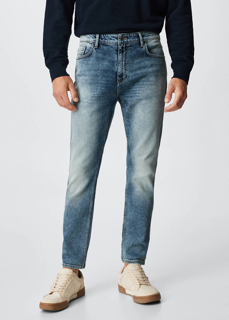Tapered fit: wide cut at the top that narrows from the knee to the ankle. Denim-style cotton fabric. Dark wash. Belt loops. Zip and button fastening. Five pockets. Denim jeans style