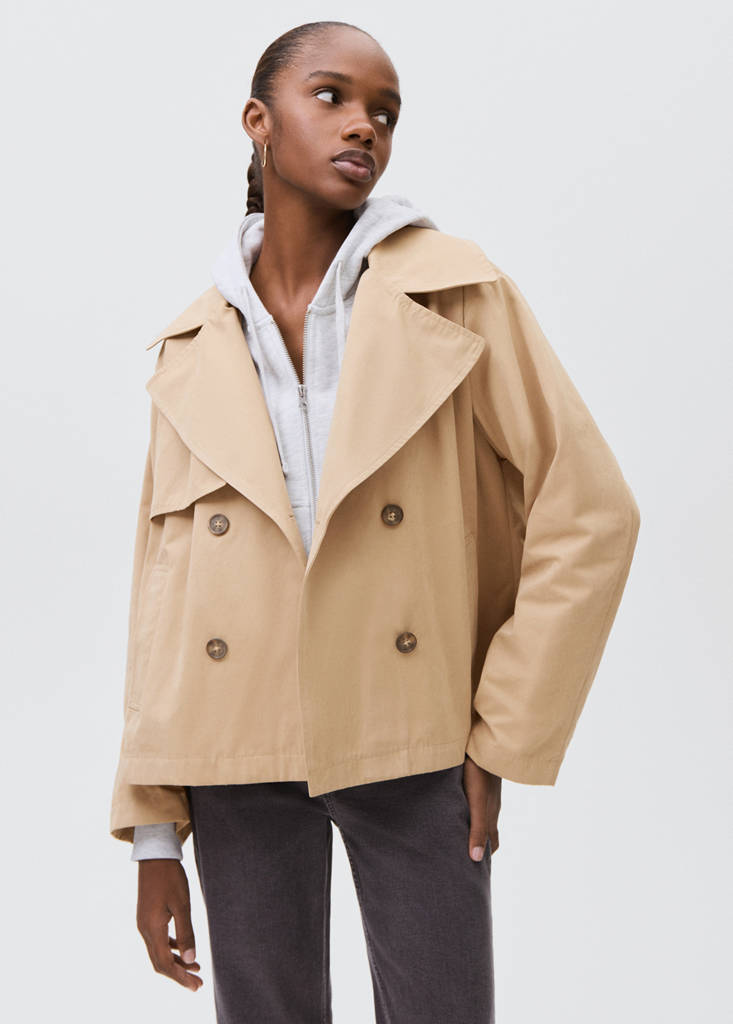 Polyester fabric. Trench design. Short design. Notched lapel collar. Long sleeves. Front closure with buttons. Two side pockets