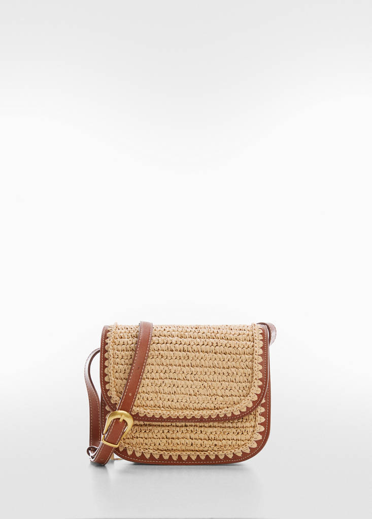 Small. Natural fibre fabric. Contrast detail. Long adjustable strap. Metallic press stud fastening. Inner lining. Festival Season