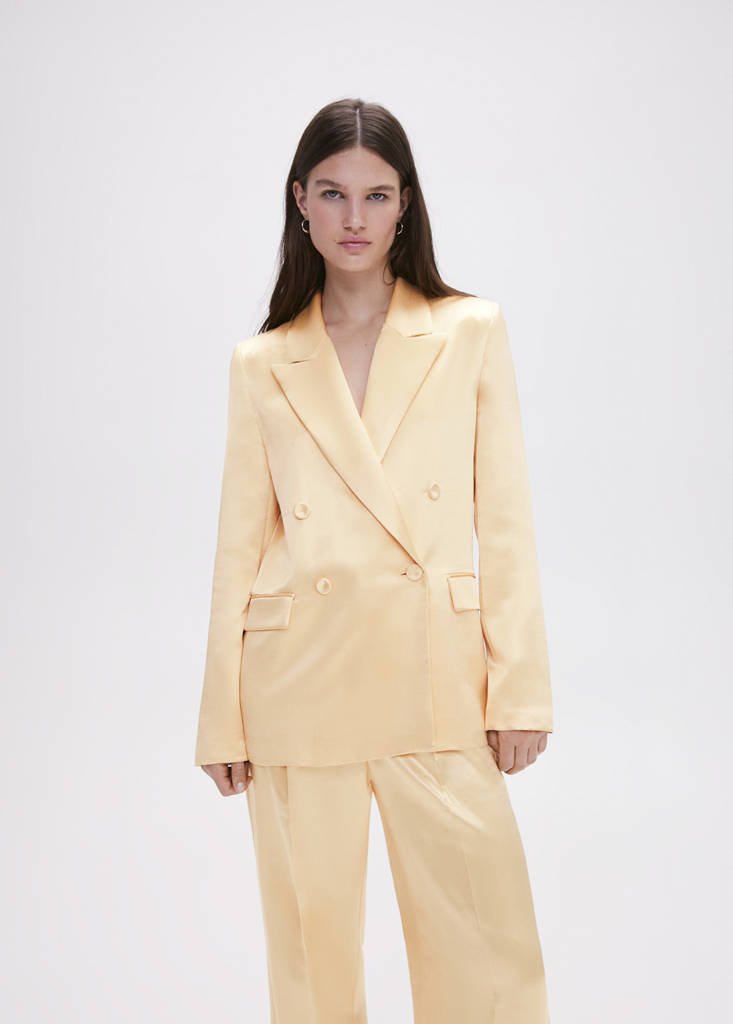 Selection Collection. Flowy fabric. Straight design. Double button design. Satin finish. Lapel-collar V-neck collar. Long sleeve. Button fastening on the front section. Side flap pockets. Inner lining. Co-ord. Party and events collection
