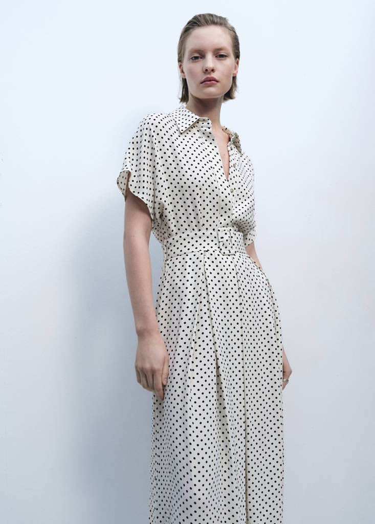 Party, ceremony and communion collection. Available Plus. Straight Design. Midi design. Polka-dot print. Shirt collar. Short sleeves. Belt loops. Belt buckle fastening. Pleats detail. Front closure with buttons. This garment belongs to our event collection, designed to make you the perfect guest at any party, wedding or ceremony
