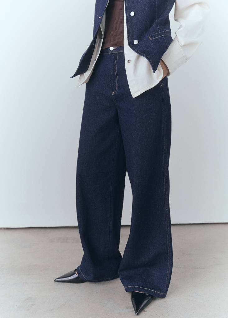 Denim-style cotton fabric. Wide-leg design. Rinse wash. Wide leg. Long design. Mid-rise. Belt loops. Five pockets. Front zip and button closure. Total look