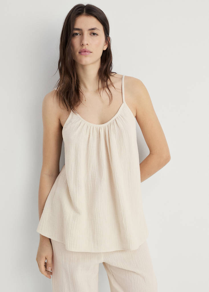 Two-piece pyjama. 100% cotton fabric. Short design. Low back with thin straps. Plain colors. Combines comfort and style. Its minimalist design offers a contemporary aesthetic that focuses on quality and simplicity. Available in two colours. Coordinates with more products from the collection. Gathered round neckline