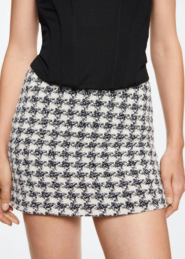 Tweed fabric. Cotton-blend fabric. Houndstooth print. Short design. Fitted design. Invisible lateral zip fastening. Inner lining. Co-ord