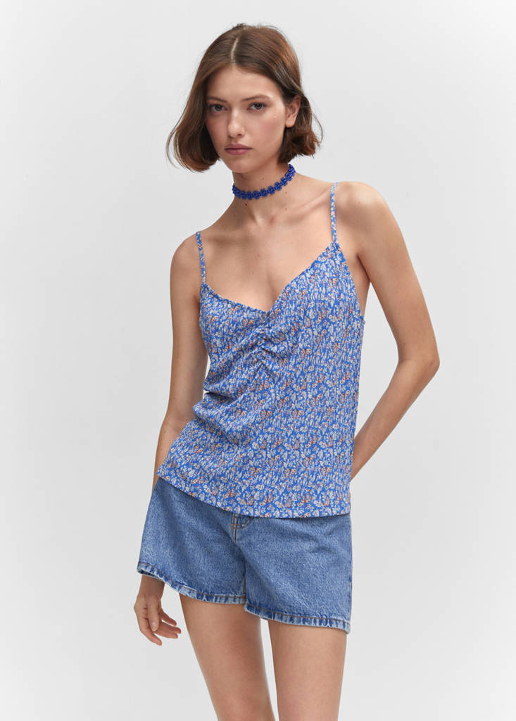 Fluid fabric. Straight design. Low neckline. Thin straps. Back neckline. No Fastening. Ruched details