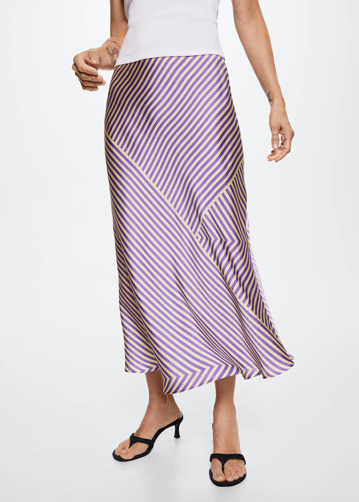 Satin. Bengal stripe print. Evasé design. Midi design. Elastic waist. Plus Size Available. Party and events collection