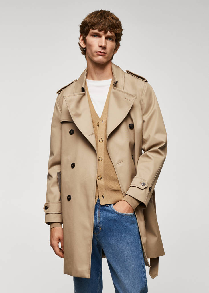 ESSENTIALS: Made to last. Basics Collection. Waterproof fabric. Medium design. Notch lapels and buttonhole. Metal hook closure on the neck. Design with double-breasted front closure. Inner counterbutton for better grip of the outer button. Decorative shoulder straps. Long sleeves with adjustable loops. Twin buttoned flap pockets at front. Removable belt at the waist. Inner lining. Interior pocket. Back vent at the hem. The green colour is an online exclusive. Water-repellent: The durable finish of this garment protects against light rain, repelling contact with water and raindrops