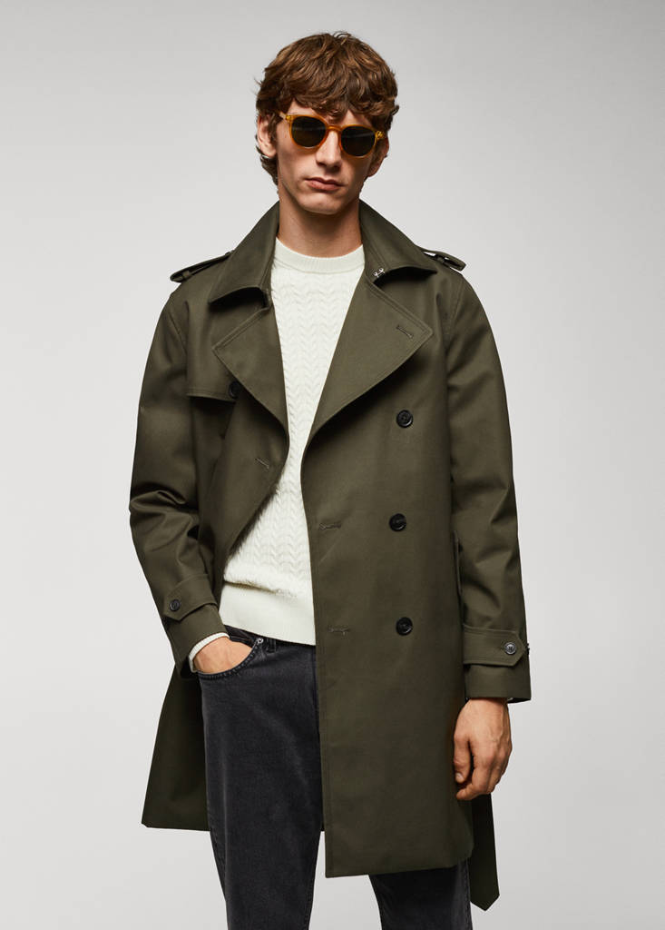 ESSENTIALS: Made to last. Basics Collection. Waterproof fabric. Medium design. Notch lapels and buttonhole. Metal hook closure on the neck. Design with double-breasted front closure. Inner counterbutton for better grip of the outer button. Decorative shoulder straps. Long sleeves with adjustable loops. Twin buttoned flap pockets at front. Removable belt at the waist. Inner lining. Interior pocket. Back vent at the hem. The green colour is an online exclusive. Water-repellent: The durable finish of this garment protects against light rain, repelling contact with water and raindrops