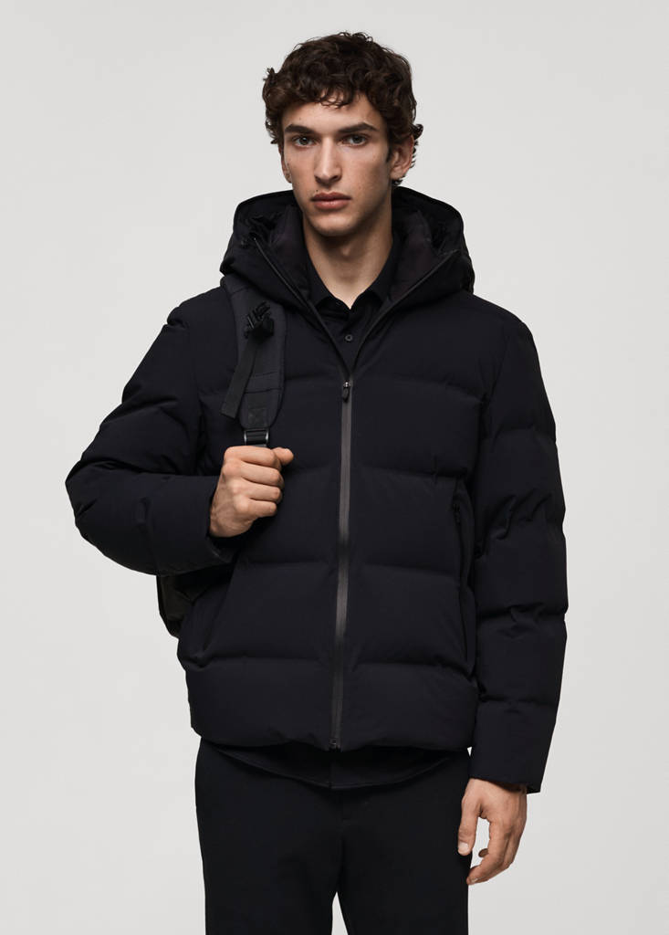 Performance Collection. The colour black is exclusively online. Comfort Stretch: Stretch fabric for added comfort. Non-crease. Quilted design. Drawstring hood. Long sleeves. Two front pockets with heat-sealed finish. Technical features such as double cuffs, adjustable hood and hem and water-repellent front fastener designed to keep out the rain and the wind. Front closure with heat-sealed zip. Hem with adjustable interior drawstring. 80/20 down and feather filling. Thermoregulating: This fabric offers optimal breathability to keep you at a stable temperature. Waterproof: This durable finish prevents water from penetrating through the fabric, providing the best possible protection against the rain. Windproof: This durable material offers protection against the wind for greater comfort in outdoor lifestyle. Comfort: Horizontal and vertical stretch fabric for added comfort