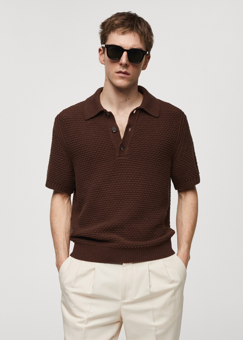 Knitted braided fabric. Midpoint. Polo-neck with button closure. Short sleeves. Designed and manufactured in Italy. 100% cotton fabric. Untrimmed hem.