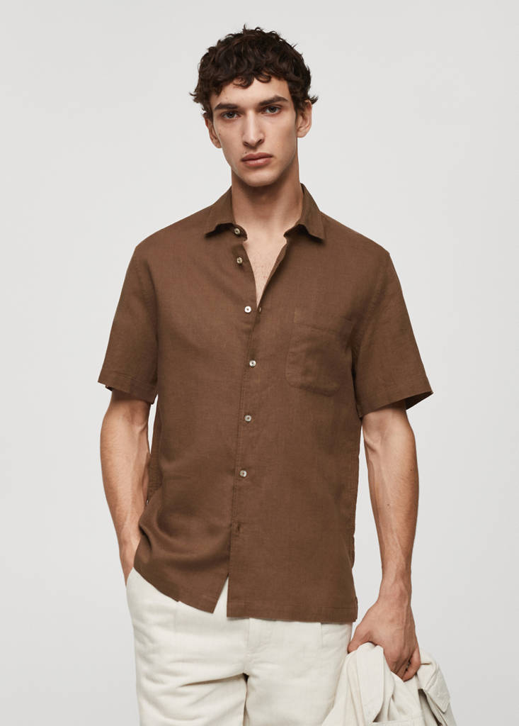 Khaki is an online exclusive. Regular fit. Linen and cotton blend fabric. Shirt collar. Short sleeves. Patch pocket on the chest. Straight hem. Front closure with buttons