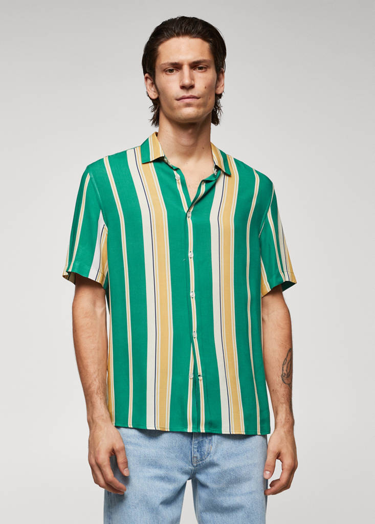 Regular fit. Fluid fabric. Striped print. Shirt collar. Short sleeves. Straight hem. Front closure with buttons