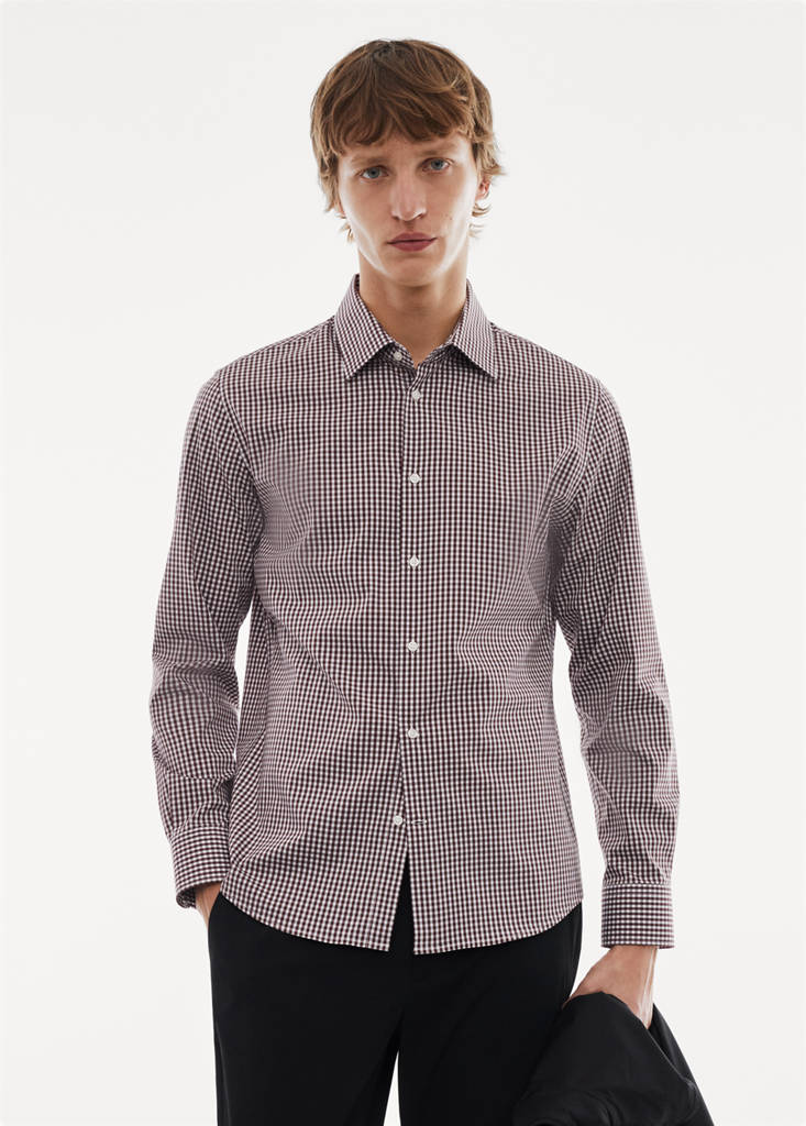 Performance Collection. Easy iron. Stretch fabric providing maximum comfort and freedom of movement. Slim fit. Cotton and polyester blend fabric. Micro gingham check print. Shirt collar. Long sleeves with buttoned cuffs. Front closure with buttons. Rounded base