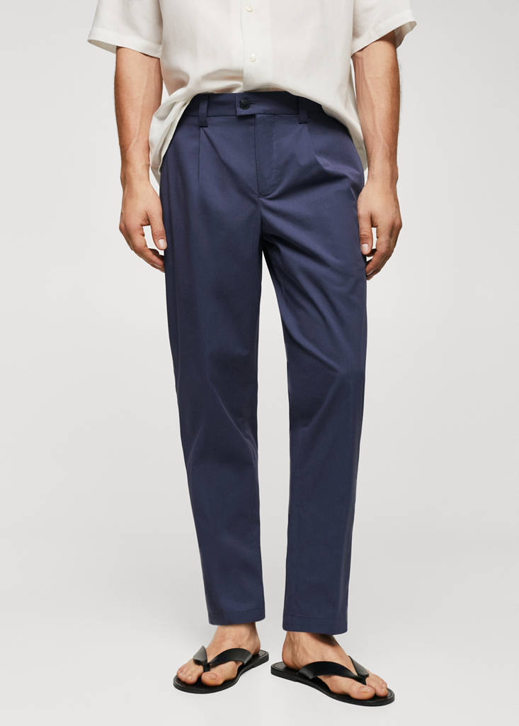 Slim fit. Cotton-blend fabric. Dart detail. Loops. Two side pockets. Two welt pockets with button on the back. Zip and one button fastening. The model is 183cm and is wearing a size 42