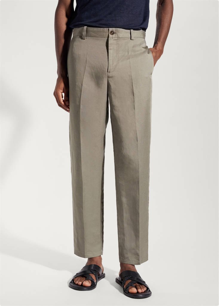 Slim fit. Linen and lyocell blend fabric. Loops. Two side pockets. Two pockets with flaps on the back. Zip and one button fastening. The model is 183cm and is wearing a size 42. Total look available. Tailoring collection. Basics Collection. Antoine Griezmann Campaign