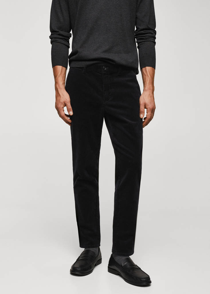 Slim fit. Cotton blend fabric. Micro corduroy. Crop design. Zip and button fastening. Belt loops. Waist with adjustable inner cord. Two front pockets. Two welt pockets with button at the back