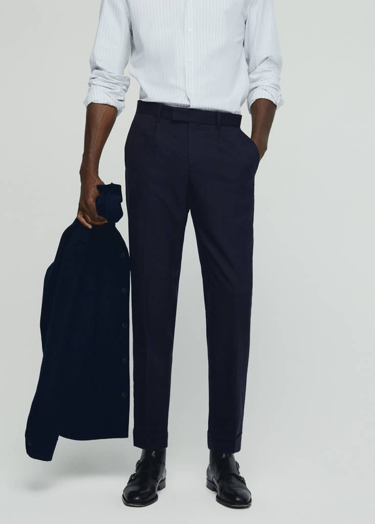 Virgin wool blend fabric. Anti-bacterial fabric. Slim fit. Concealed button, hook and zip fastening. Belt loops. Front pleat detail. Two front pockets. Two pockets with buttoned flaps on the back. Flared hem. Pressed crease detail at the front and back