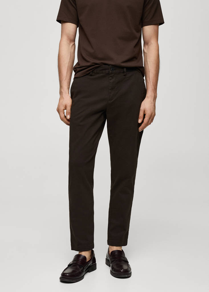 Tapered fit: wide cut at the top that narrows from the knee to the ankle. Sustainable cotton blend fabric. Crop design. Chinos style. Belt loops. Soft elastic at front side waistband for added comfort and support the growing bump. Zip and button fastening. Two side pockets. Two pockets with buttoned flaps on the back. Belt loops. Basics Collection. Waist with adjustable inner cord. Coin pocket at hip height. The model is wearing a size 42. Cotton fabric. Side pockets. Coin pocket. Button and lace closure. Elasticated waistband. Elastic band. Lightweight fabric. Two front pockets. Cotton and polyester blend fabric. Slim fit. Floral print. Button up. Short sleeves. Classic collar